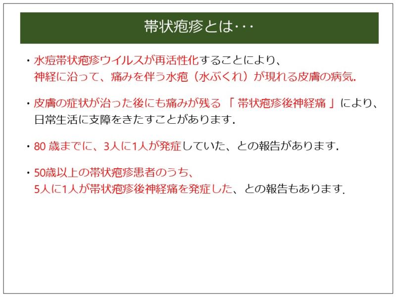 皮膚症状が改善した後も、痛みが消失せず日常生活に支障をきたす事例があります。